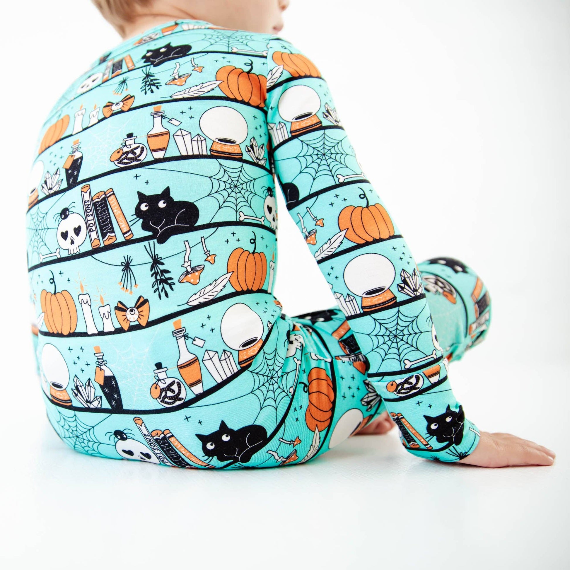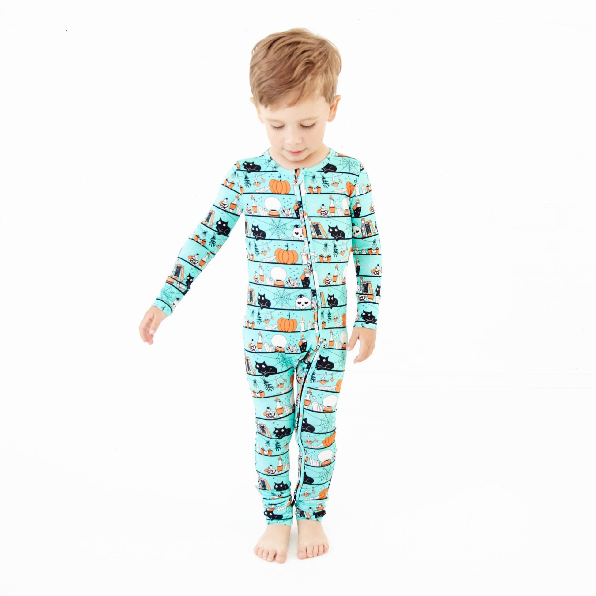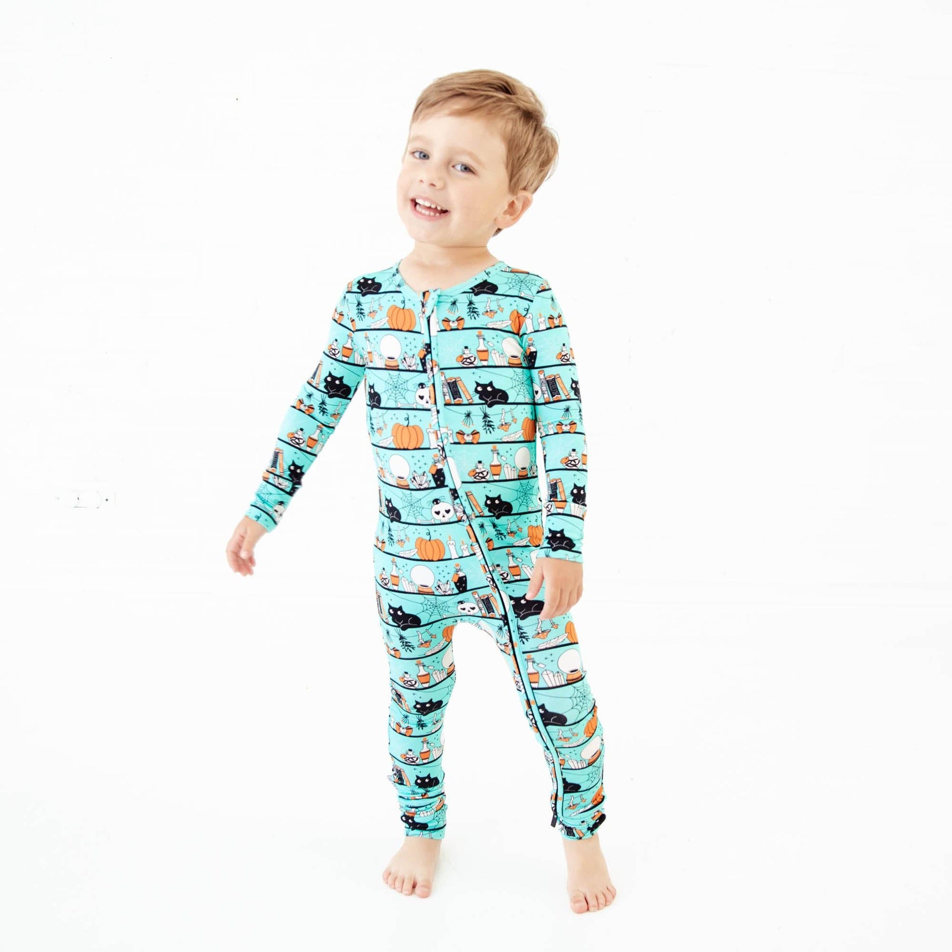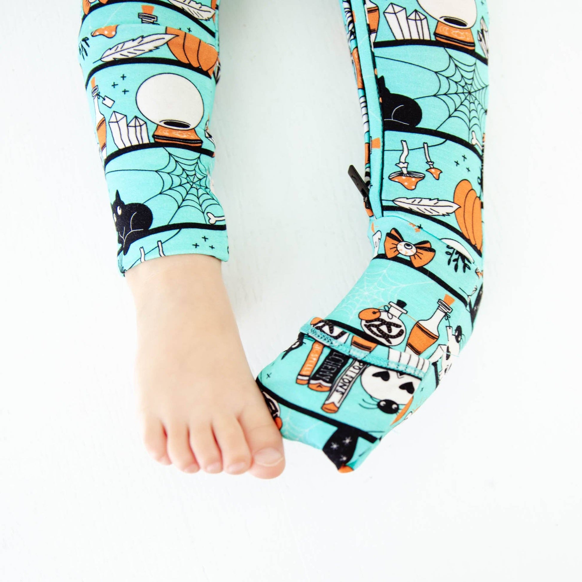 Welcome to Spooky Season... this collection has everything you could imagine seeing on a trip to the magic shop! Black cats, spiderwebs, magic potions and more! Whether you prefer a footie or romper, this all-in-one convertible piece does it all! Made with two way zippers for easy changes, this adorable romper features fold over cuffs on the ankle which converts this romper to a footie as desired (and fold over hand cuffs up to 6-12 Months). This piece is designed to last twice as long as the average footie, due to the extra length and super stretchy fabric.