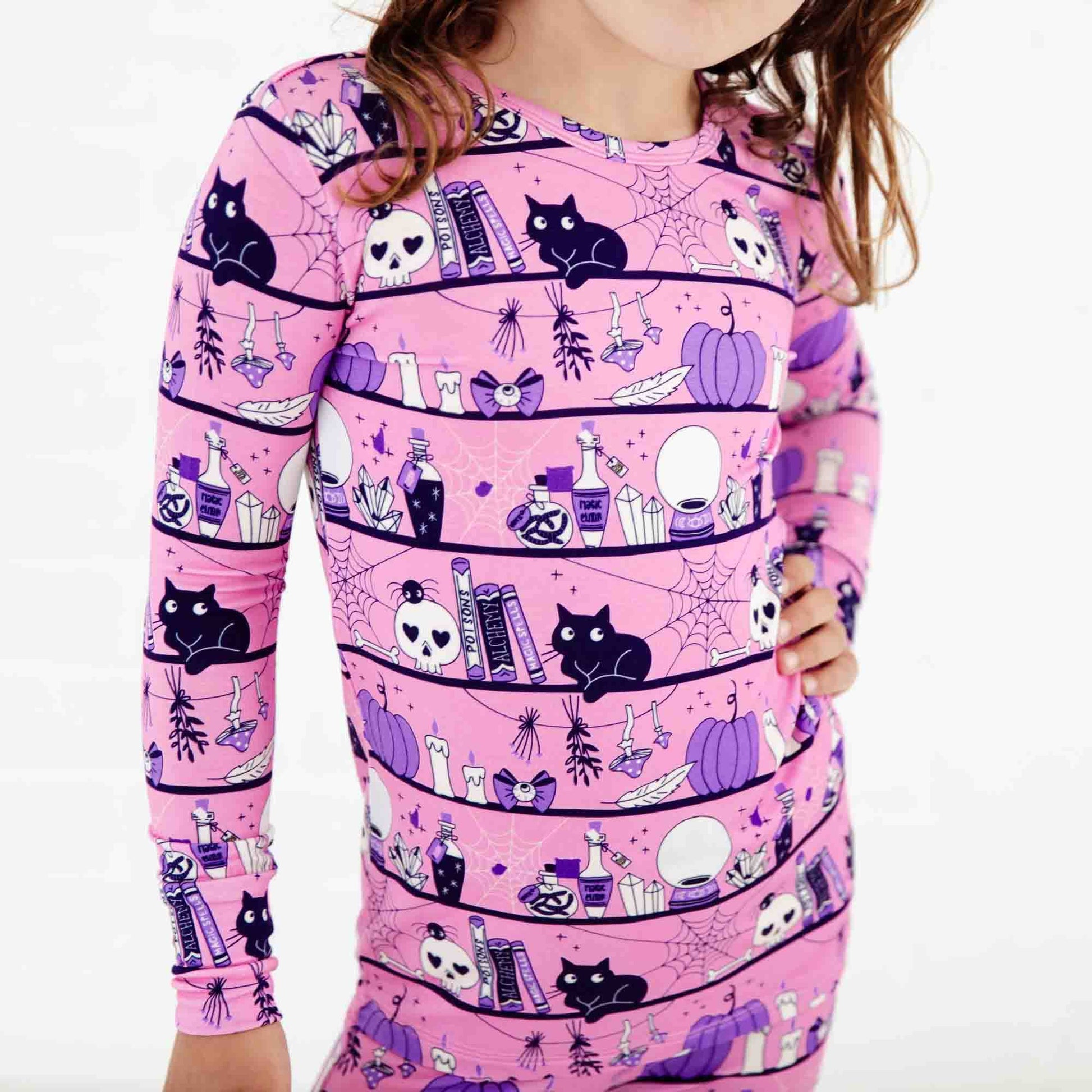 Welcome to Spooky Season... this collection has everything you could imagine seeing on a trip to the magic shop! Black cats, spiderwebs, magic potions and more! Made with the same soft and stretchy bamboo viscose as our other family pajamas + footies, these two piece jamms are perfect for your favorite toddler or big kid! Features a long sleeve top and matching pant with elastic waist. Designed with a little extra length, which means they fit longer than your average pajamas!
