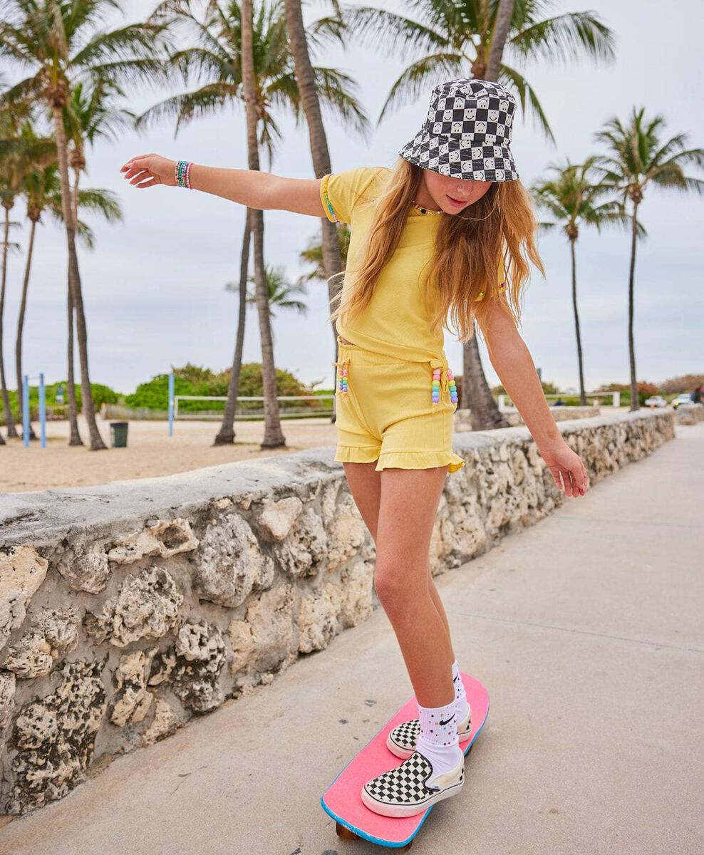 This Lola + The Boys Candy Beaded Gem Ruffle Set Yellow is lightweight and breezy, perfect for summer outings, playdates, or adding a vibrant splash to casual wear. A cheerful two-piece set in sunny yellow, featuring a short-sleeve top and matching shorts with playful ruffle trim and colorful beaded accents. The elastic-waist shorts include a decorative drawstring with candy-like beads for a fun and whimsical touch.