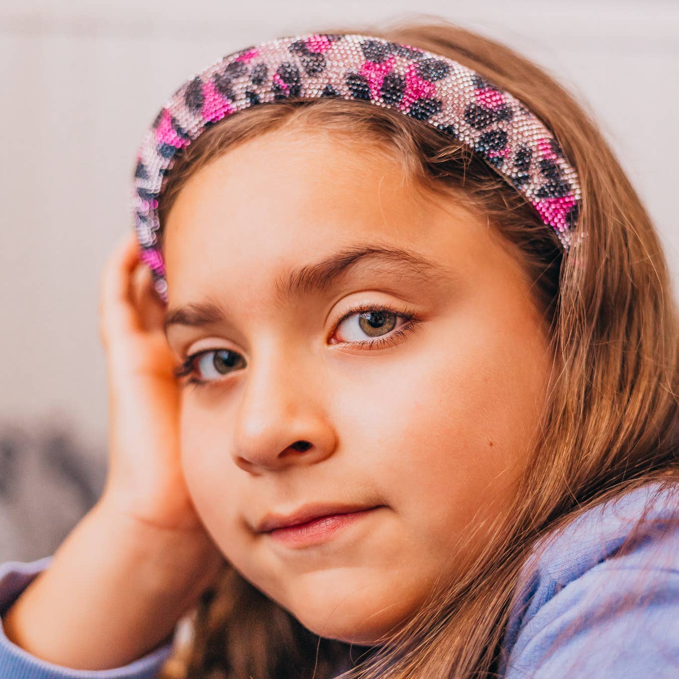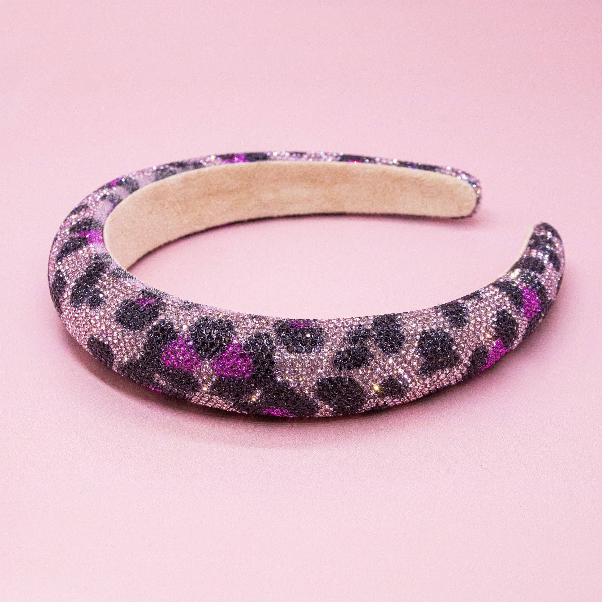Puffy tapered headband embellished with sparkly rhinestones in a magenta and purple leopard print design. Flexible band with a comfortable non slip inner lining.