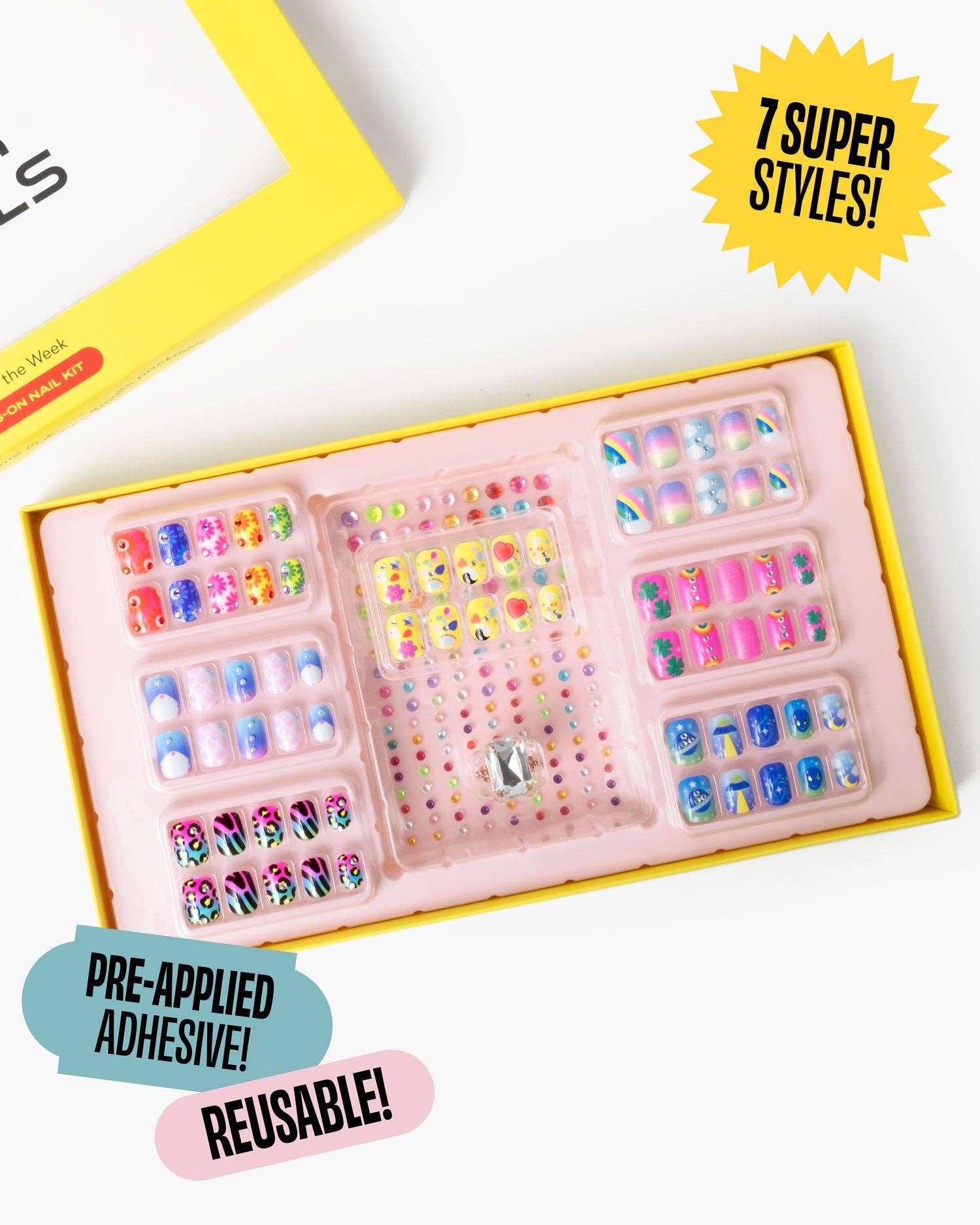 Nail Your Week In Style! Whether you're feeling fierce on Monday or fabulous on Friday, our Days of The Week Press On Nail Kit has a design for every mood. With seven wild and wacky styles, you’ll be rocking everything from flower power to mermaid magic, leopard print, rainbow vibes, lucky 4-leaf clovers, and even aliens (because why not?). Each set comes with gentle adhesive stickers that make putting them on (and taking them off) a total breeze. Set includes a dazzling adjustable ring and gem stickers to add that extra sparkle.