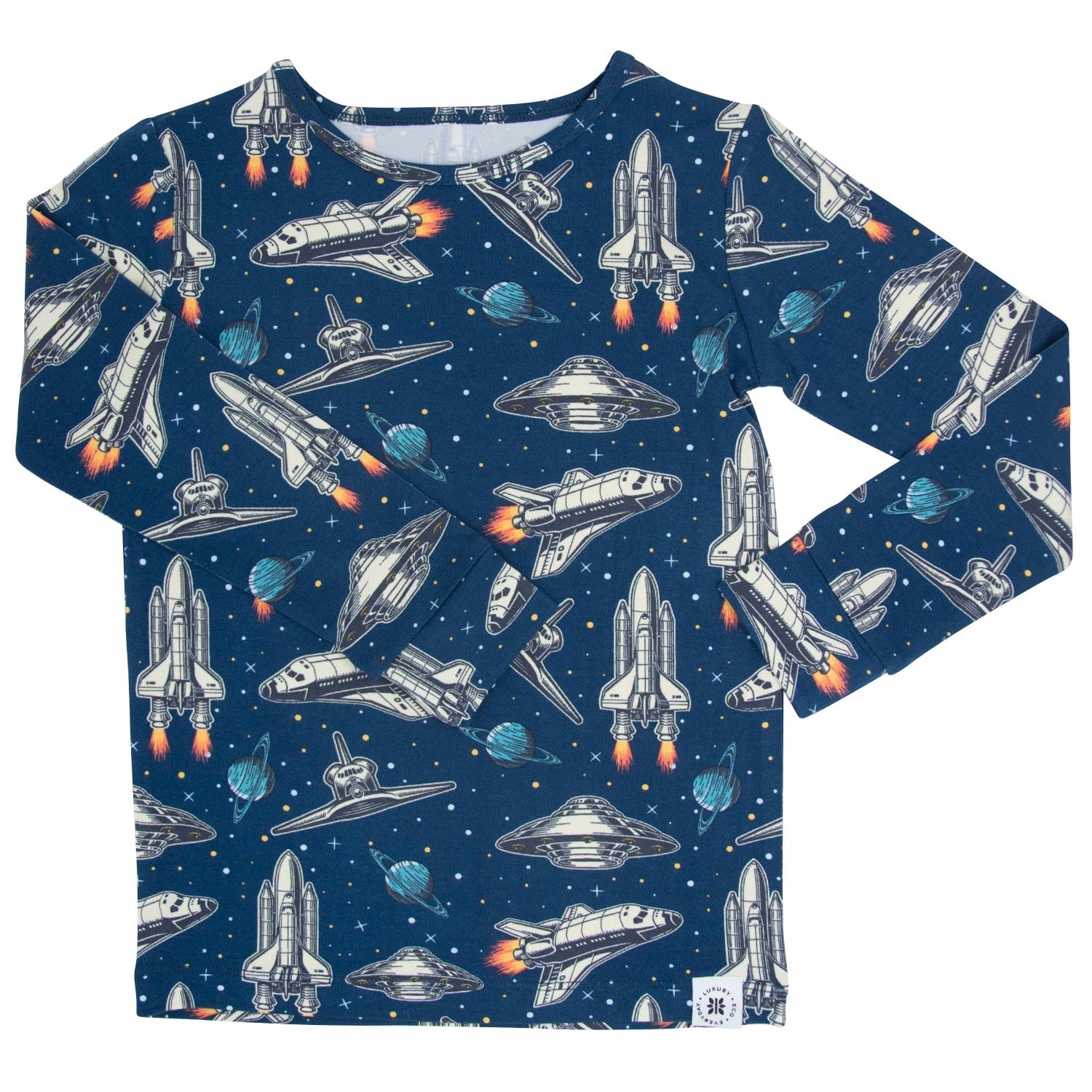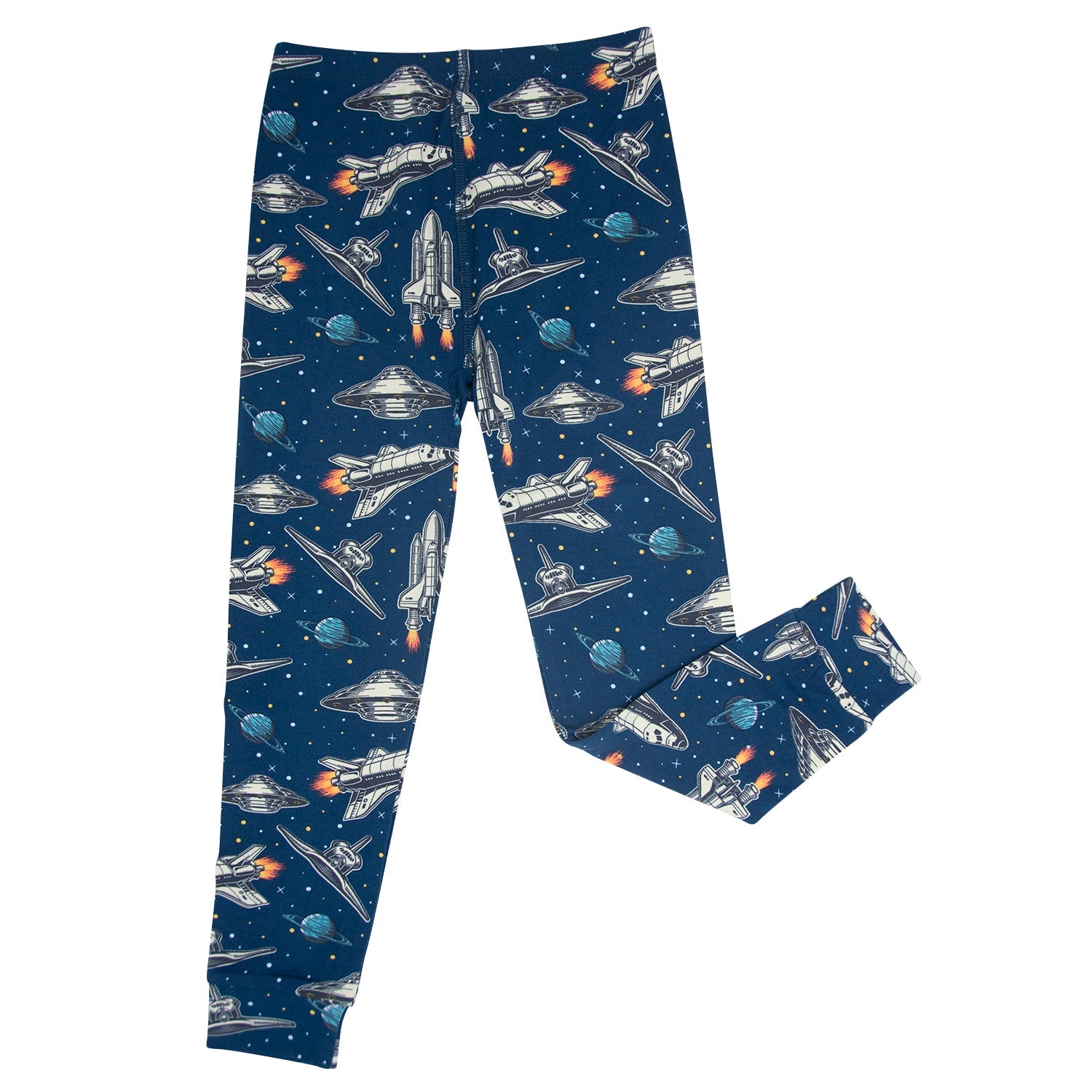 Deep In Orbit Bamboo Pajama Set. Presenting the softest, most luxurious pj's! This signature bamboo fabric is good for the Earth and for your children. Irresistibly adorable and genuinely LOVED by kids. Long sleeve top and matching pant. Cuffed legs and arms. Elastic waistband. Safe for sensitive skin. Tagless size label for total comfort. With pj's this comfortable, your kids will put themselves to bed.