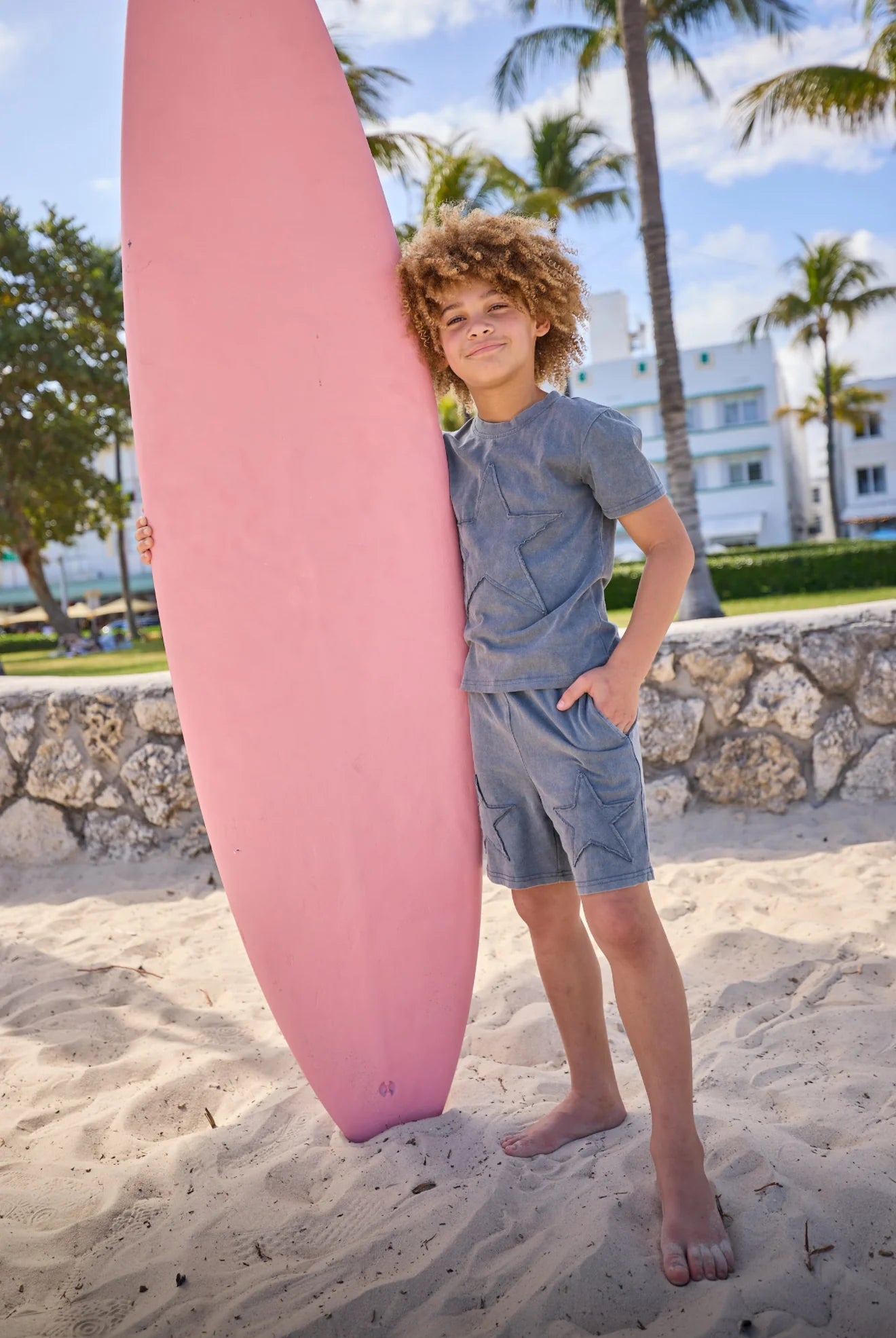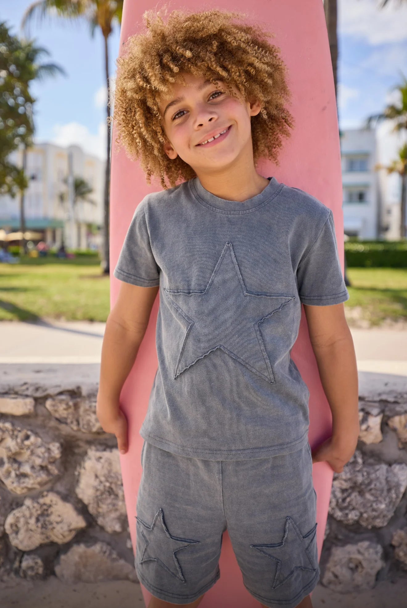 Stand out in style with this edgy Lola + The Boys Graphic Star Short Set, featuring a bold, stitched star design on both the top and shorts. Made with a relaxed fit and crafted from comfortable fabric, perfect for everyday adventures or casual outings. A versatile and trendy addition to any wardrobe that brings effortless style.