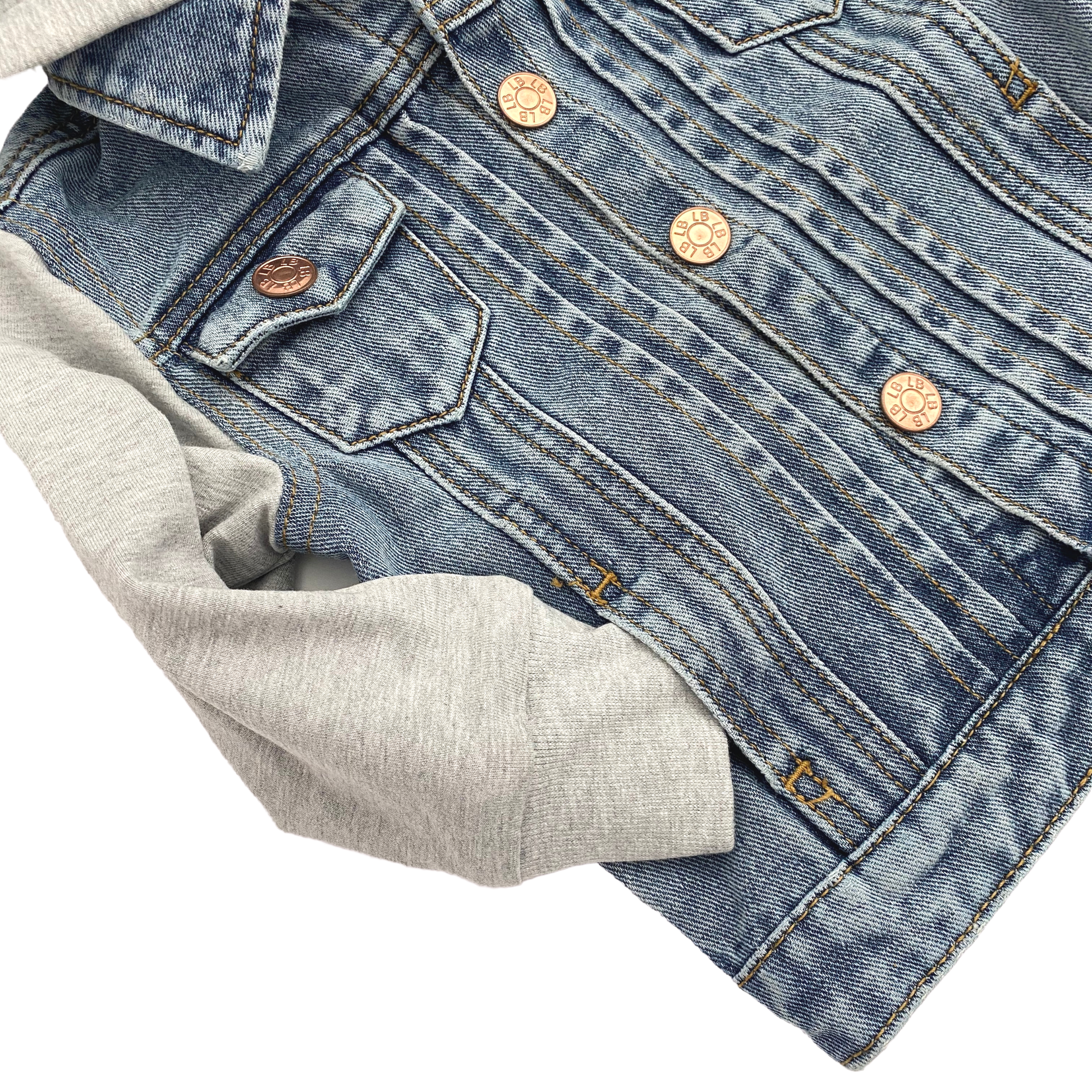 When a timeless staple is given a modern twist, you get one of our signature pieces: the Hooded Denim Jacket. The torso of our Denim Jacket is given sleeves + a hood made from our classic Core material, creating unique + versatile outerwear thatÕs sure to be the talk of the playground.Ê
