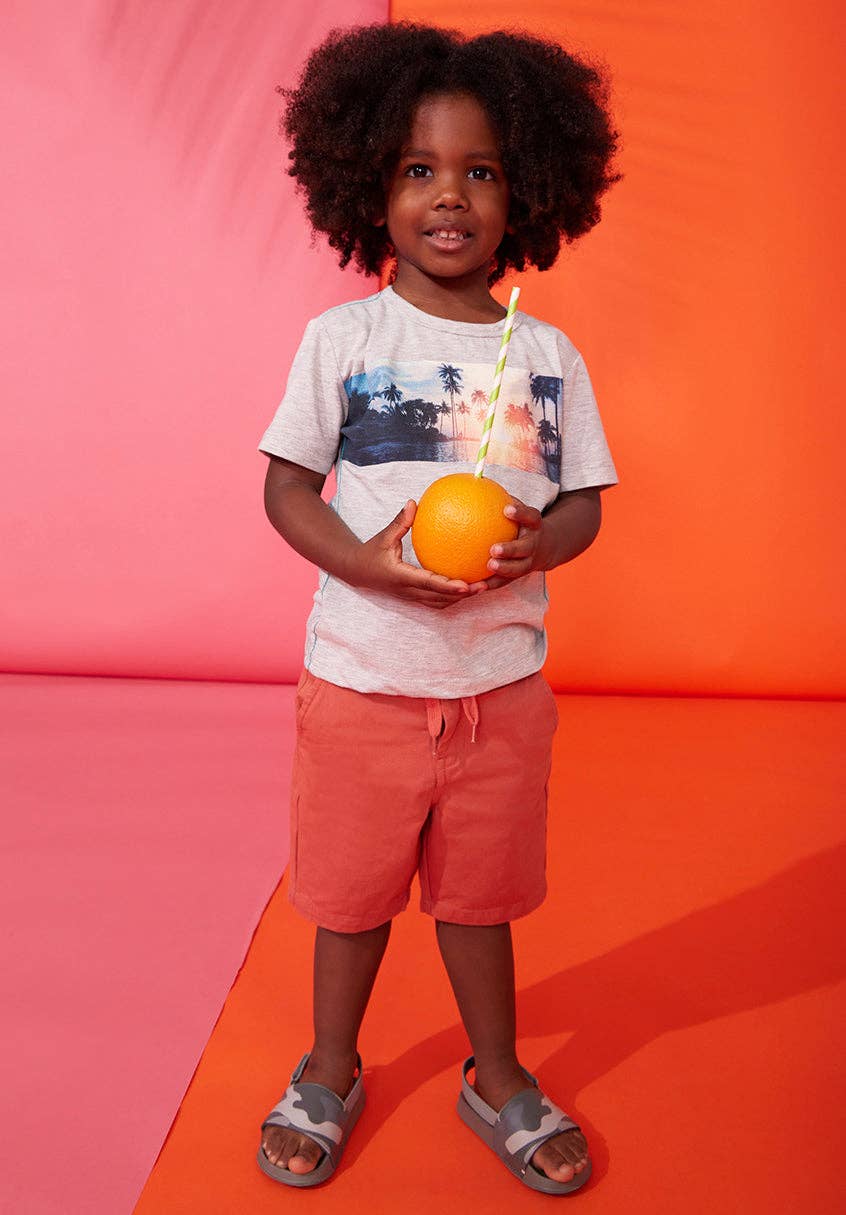 This comfy graphic top is made of light weight cotton jersey featuring crew neck, contrast chain stitch at shoulders and sides, short sleeves and Sunset graphic at the front.