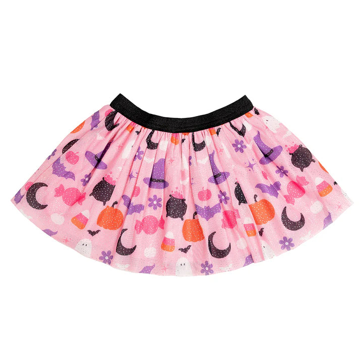 This Sweet Wink Halloween Fun Tutu is a fun skirt and dress up tutu for celebrating Halloween! Features super soft pink tulle (that doesn't scratch or itch!) printed with a Halloween pattern accented with silver glitter pin dots. Pink cotton lining for extra coverage and comfort. Shed-free black glitter elastic waistband.