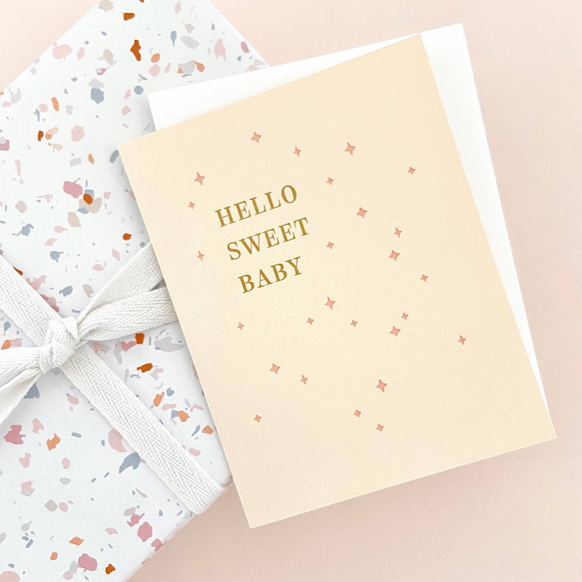 Our new baby card is super sweet in the palest blush pink. A2 size (4 1/4" x 5 1/2" folded) • blank interior • letterpress printed on heavyweight FSC cardstock • white envelope • packaged in a clear sleeve