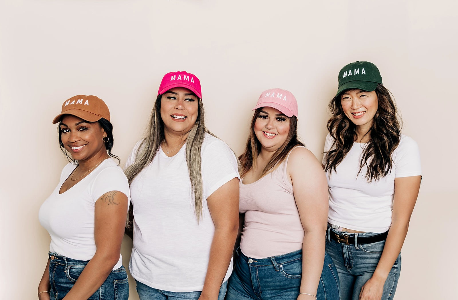 Light Pink Mama Hat. Adjustable back closure. Letter patches are hand-sewn.