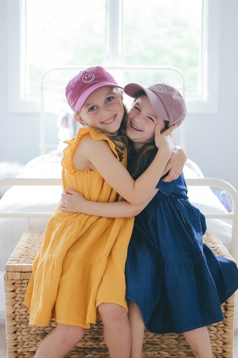 Lilac Smiley Face. Adjustable back closure. Letter patches are hand-sewn.