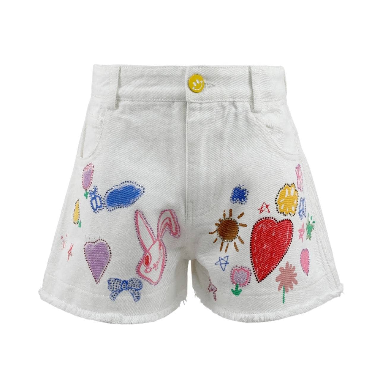 Add a playful twist to any outfit with Lola + The Boys' Love Doodle Denim Shorts, featuring vibrant embroidered designs of hearts, flowers, and more. Crafted from premium-quality denim with a relaxed fit, these shorts combine style and comfort effortlessly. Frayed hem and unique doodle artwork make these shorts a standout choice for warm days and fun outings.