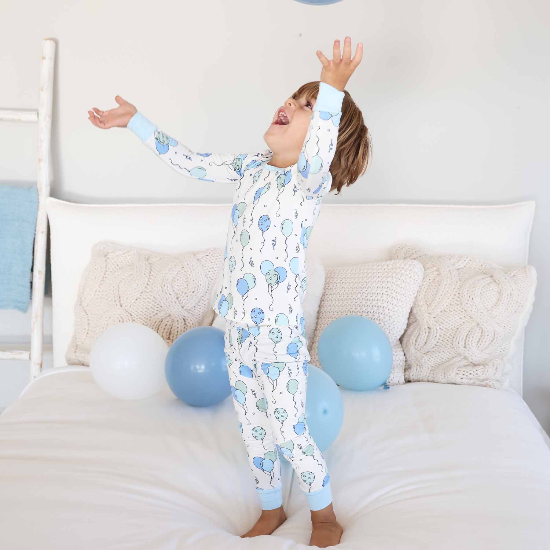 Make bedtime feel like a celebration with our Blue Party Time Two Piece Pajama Set! Filled with playful blue balloons, stars, and streamers, this festive set brings the party spirit to cozy nights and lazy mornings. Made from soft, stretchy bamboo fabric, the snug-fit keeps kids comfy through story time, sleep, and early play. Easy to wear and full of colorful charm, these pajamas are perfect for birthday sleepovers, milestone photos, or simply a