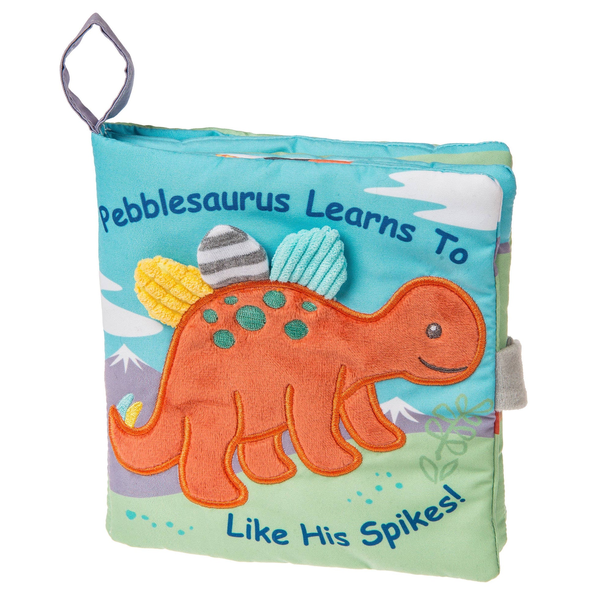 Coordinates with a matching lovey, character blanket, wubbanub, crinkle teether, rattle, and soft toy. Care for by washing in cold water on a gentle cycle, air drying; soft toy made to strict quality standards to meet or exceed US Safety requirements. 6x6" "Pebblesaurus Learns to Love His Spikes" Soft book features a fun, calming, short bedtime story. 2-dimensional book with 3-dimensional details and 8 pages. Fabric applique cover.All-embroidered details. Velcro® closure. Crinkle paper and squeaker inside.