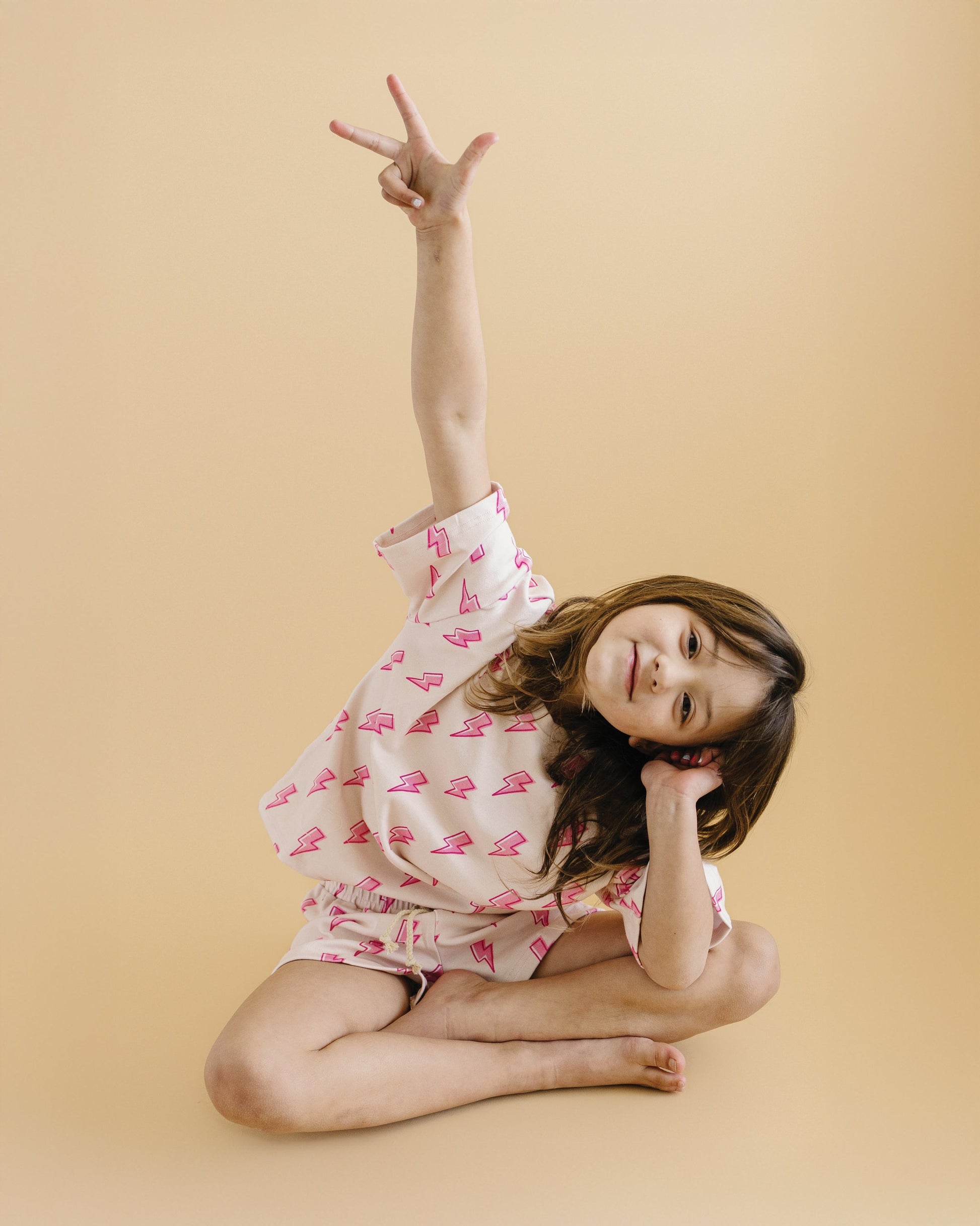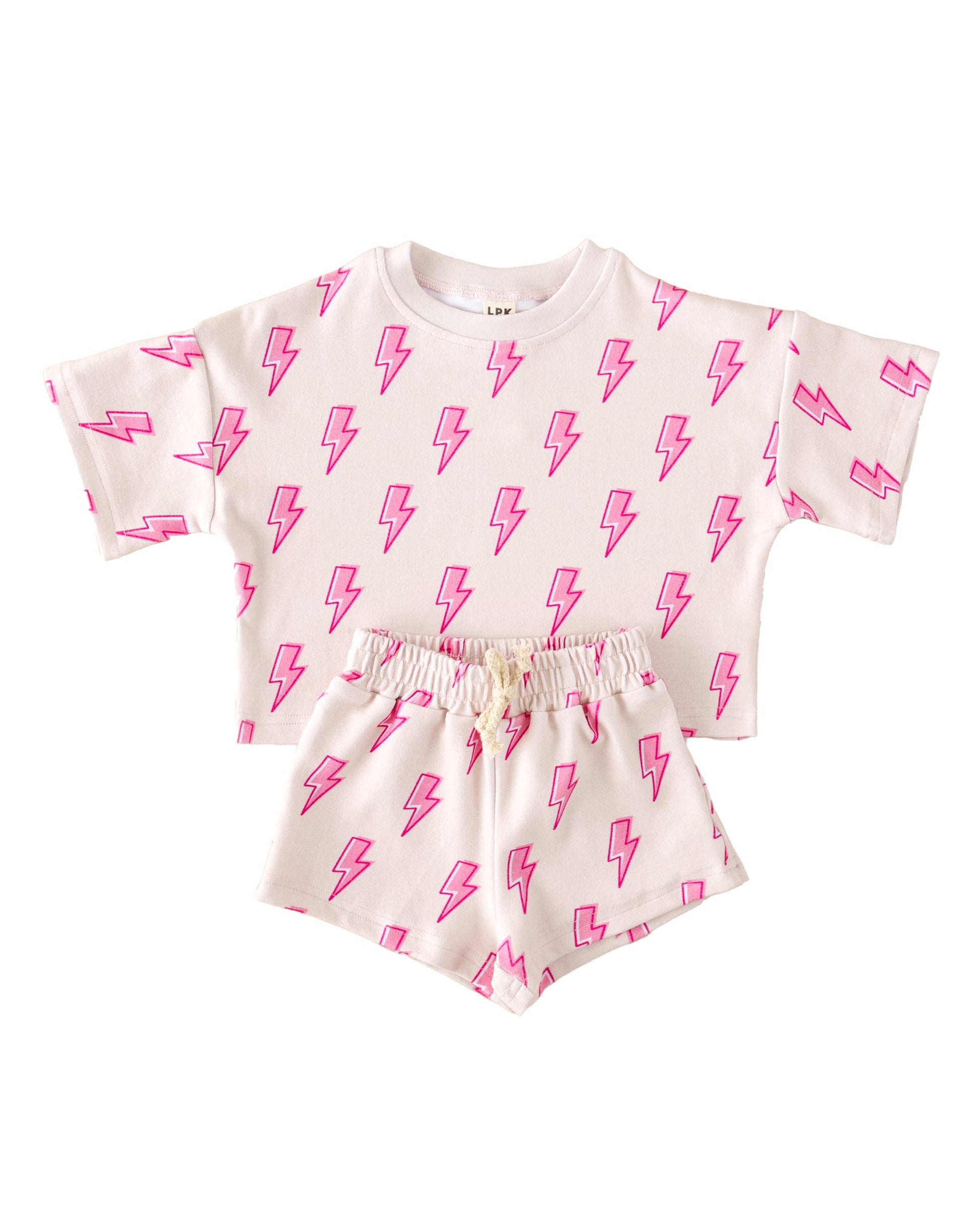 Brighten up their closet with the Pink Bolts shorts set! With a lively pink base and bold dark pink lightning bolts, this outfit brings a splash of energy and fun. Perfect for running around or hanging out, it’s designed to keep them comfy and stylish all day long.
