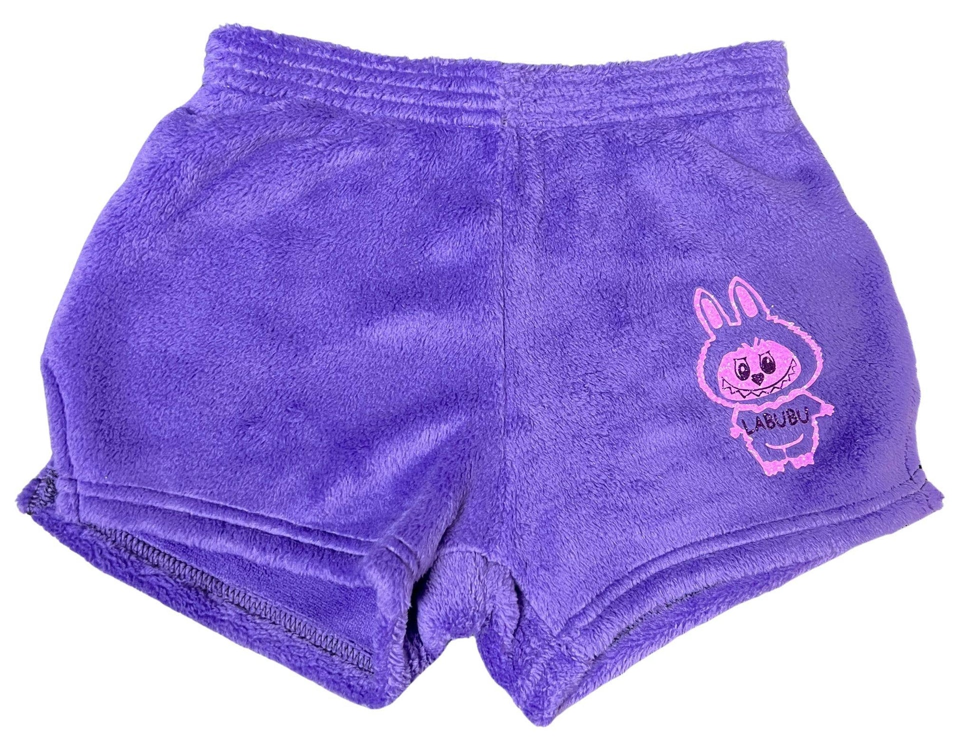 Fuzzy purple pajama shorts with Labubu glitter appliqué. Super soft, notched short with elastic waist. Runs true to size