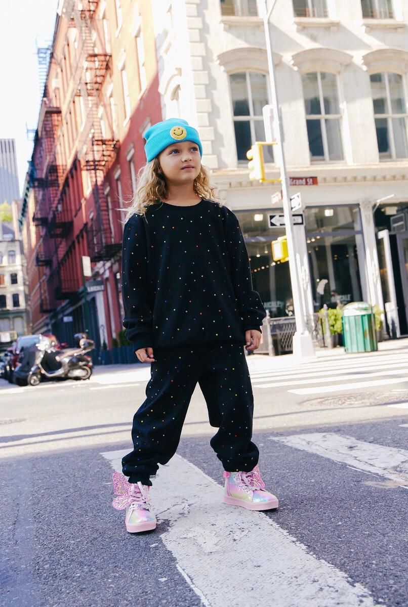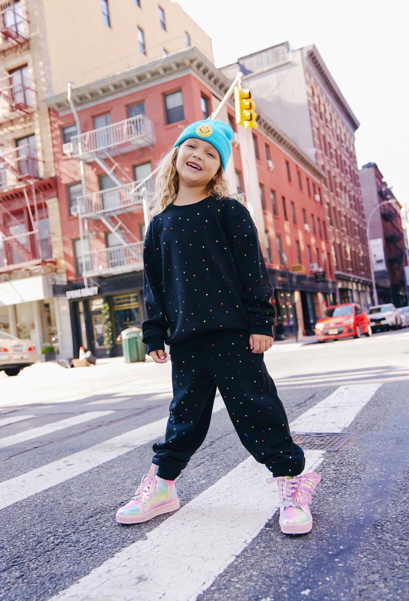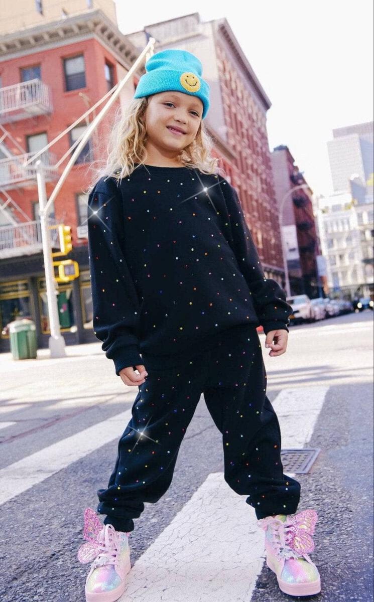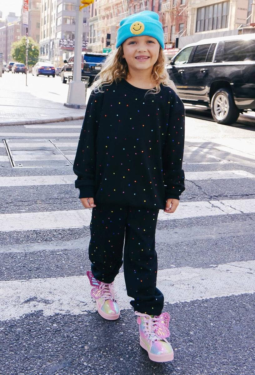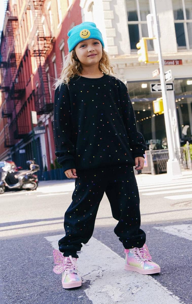 Add some sparkle to her wardrobe with this Lola + The Boys Rainbow Sparkle Track Set. Features a black sweatshirt and matching pants, both adorned with colorful rainbow sparkles. Soft, cozy fabric ensures comfort for all-day wear. The best part - you can match with Mom!