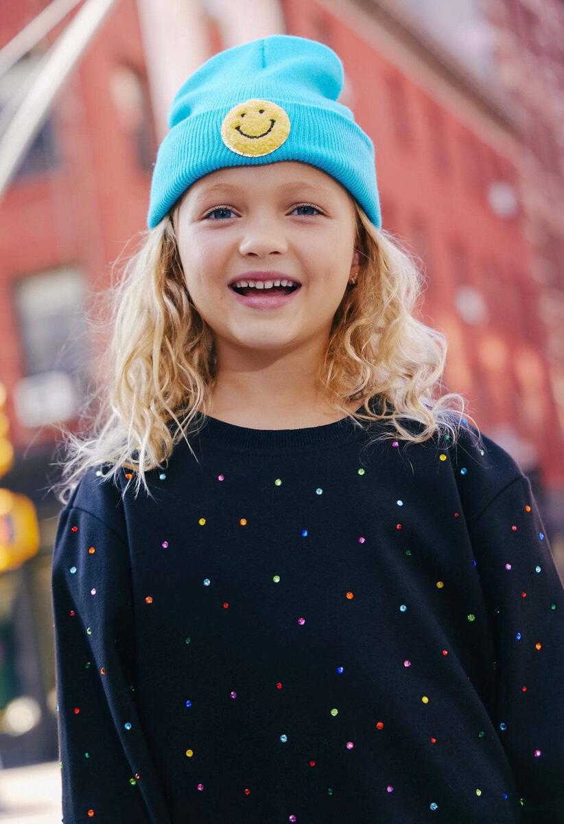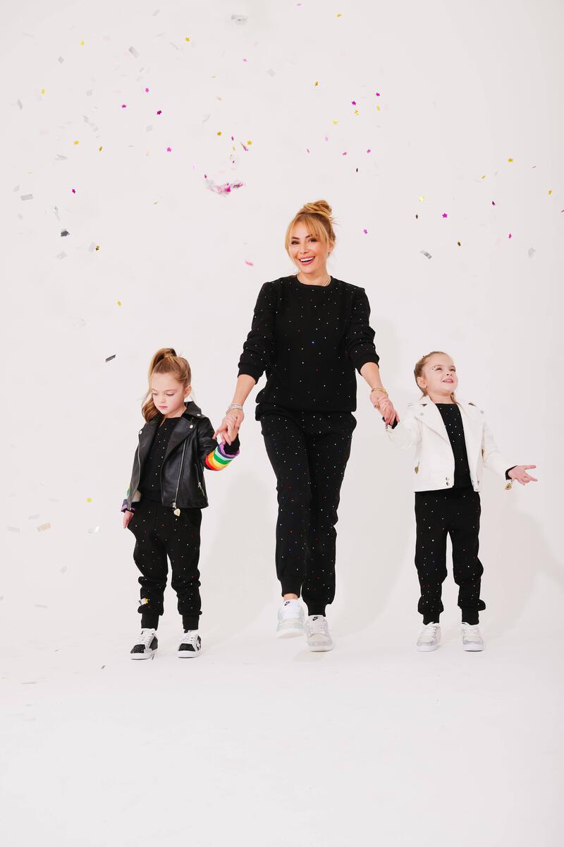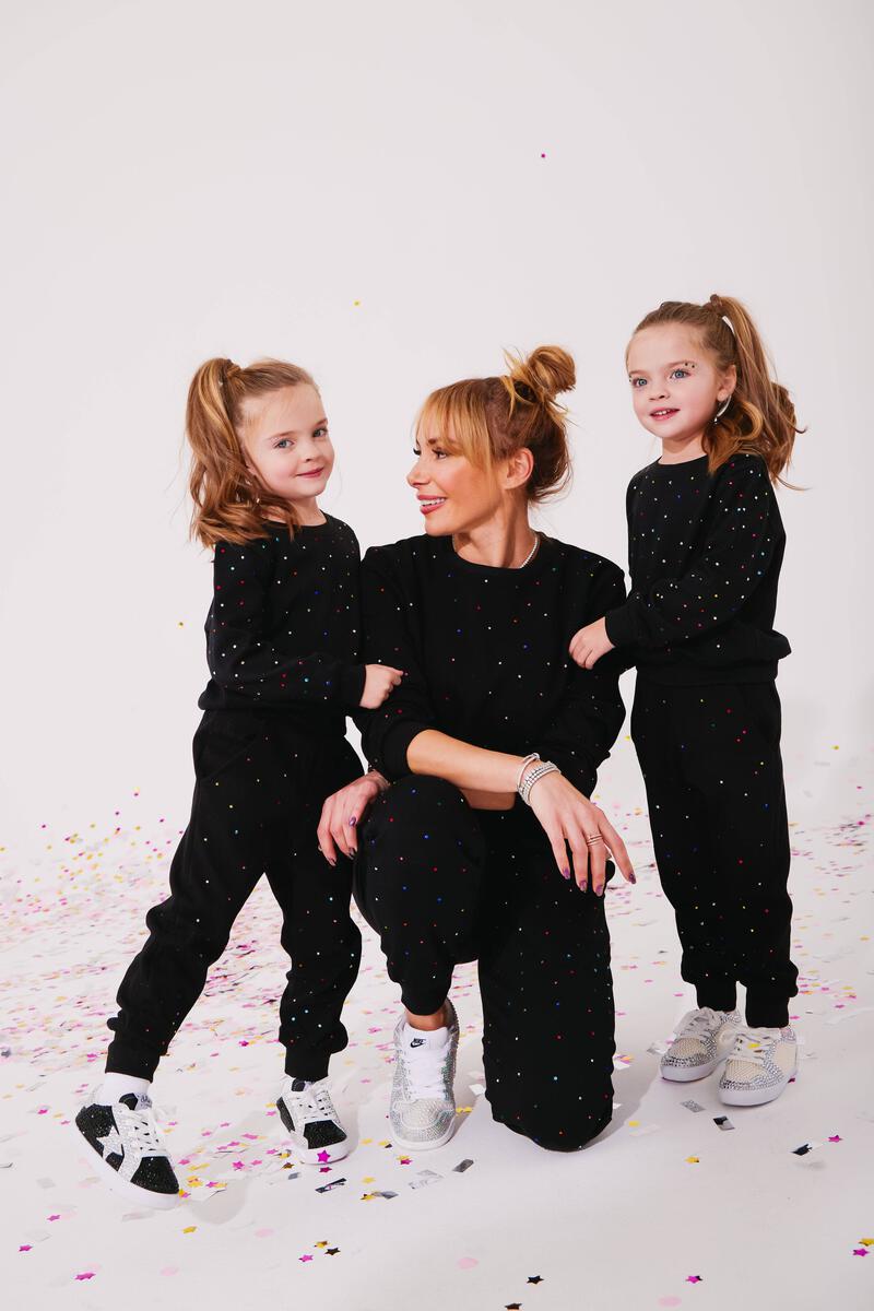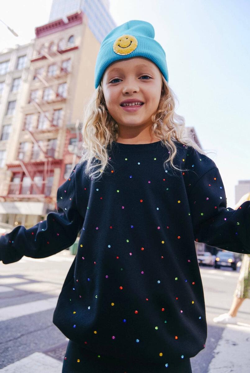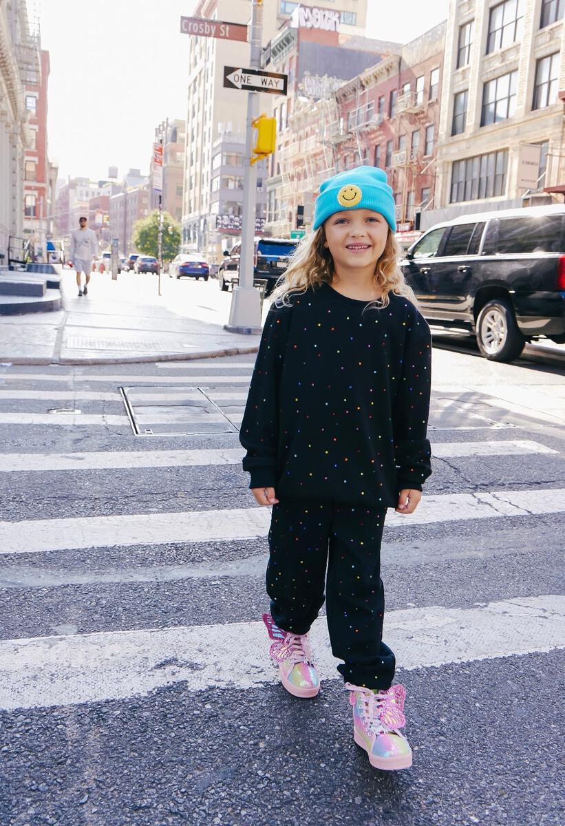 Add some sparkle to her wardrobe with this Lola + The Boys Rainbow Sparkle Track Set. Features a black sweatshirt and matching pants, both adorned with colorful rainbow sparkles. Soft, cozy fabric ensures comfort for all-day wear. The best part - you can match with Mom!