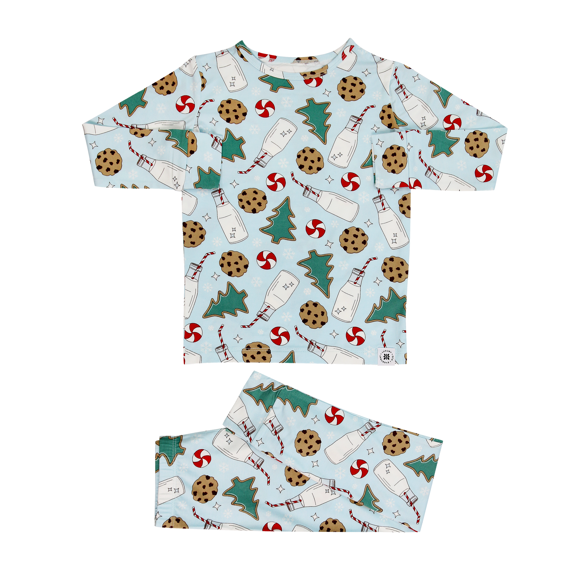 Santa's Cookies Blue Bamboo Pajama Set. Presenting the softest, most luxurious pj's! This signature bamboo fabric is good for the Earth and for your children. Irresistibly adorable and genuinely LOVED by kids. Long sleeve top and matching pant. Cuffed legs and arms. Elastic waistband. Safe for sensitive skin. Tagless size label for total comfort. With pj's this comfortable, your kids will put themselves to bed.