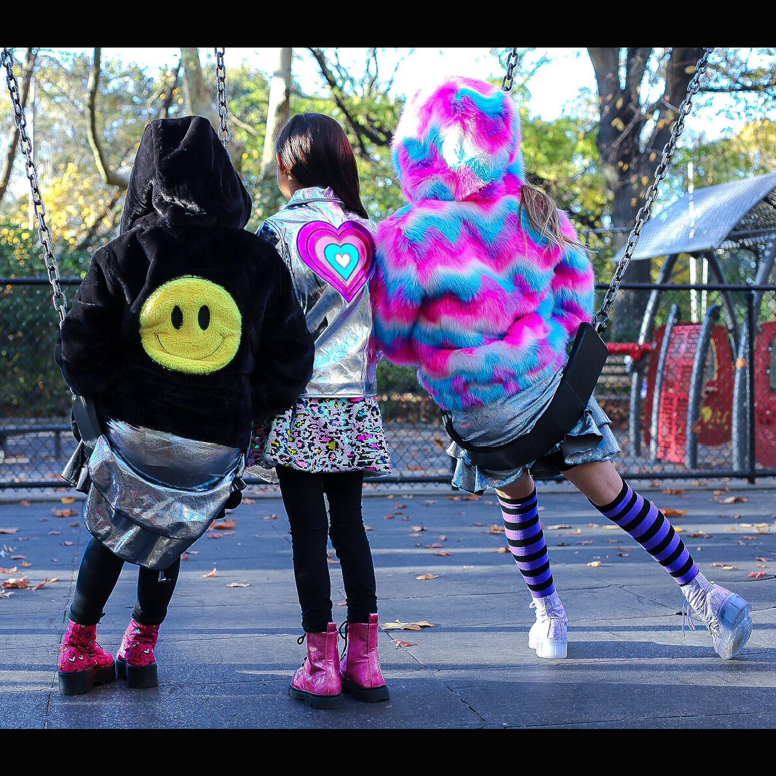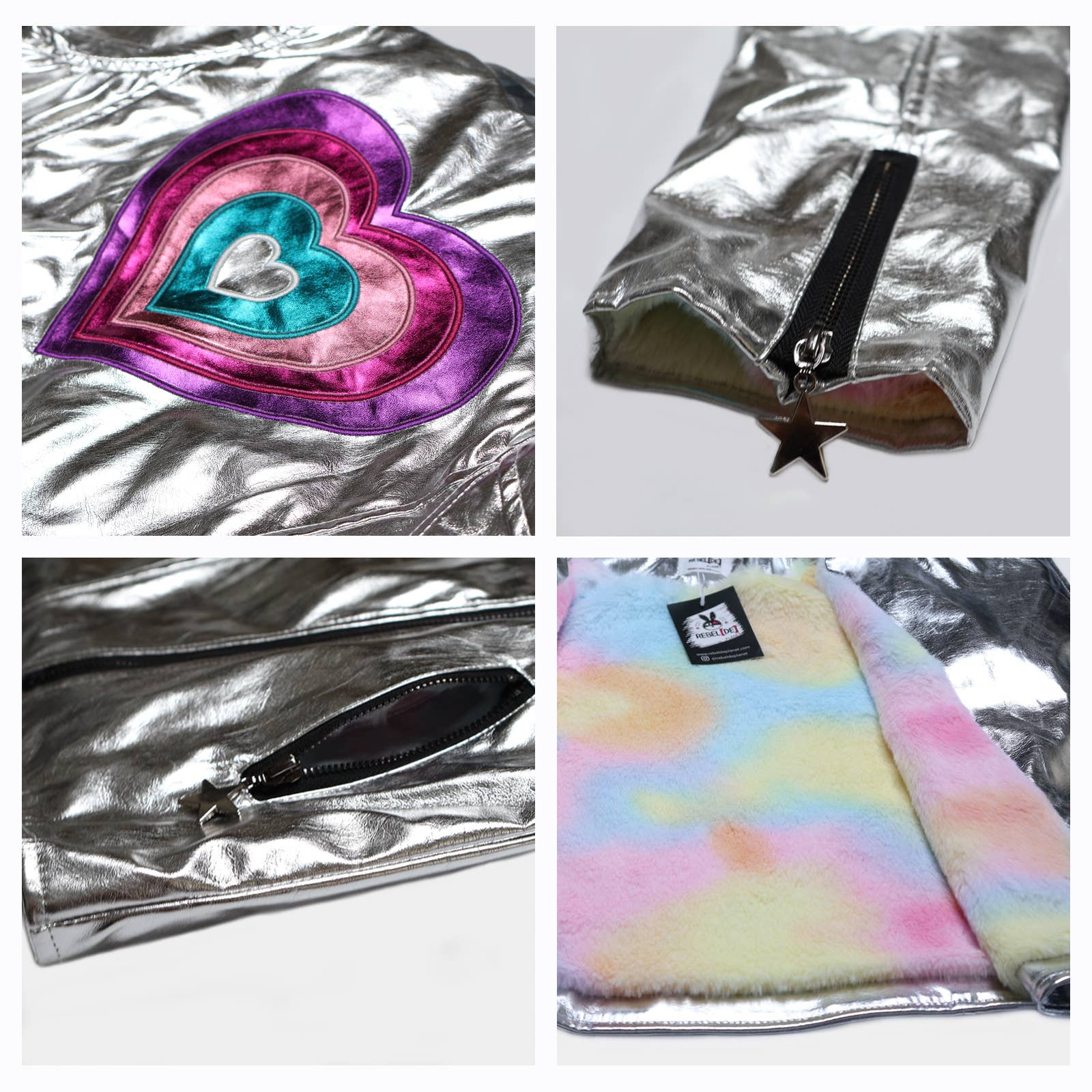 Featuring a bold rainbow heart patch on the back (because love is the vibe), this metallic masterpiece is made for dancing, strutting, and being the absolute joy of the party. 💖