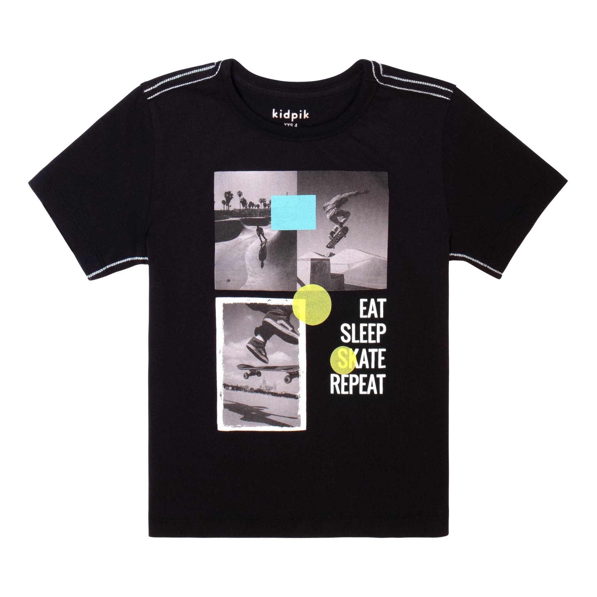 This comfy graphic top is made of light weight cotton jersey featuring crew neck, contrast chain stitch at shoulders and sides, short sleeves and Skater graphic at the front.