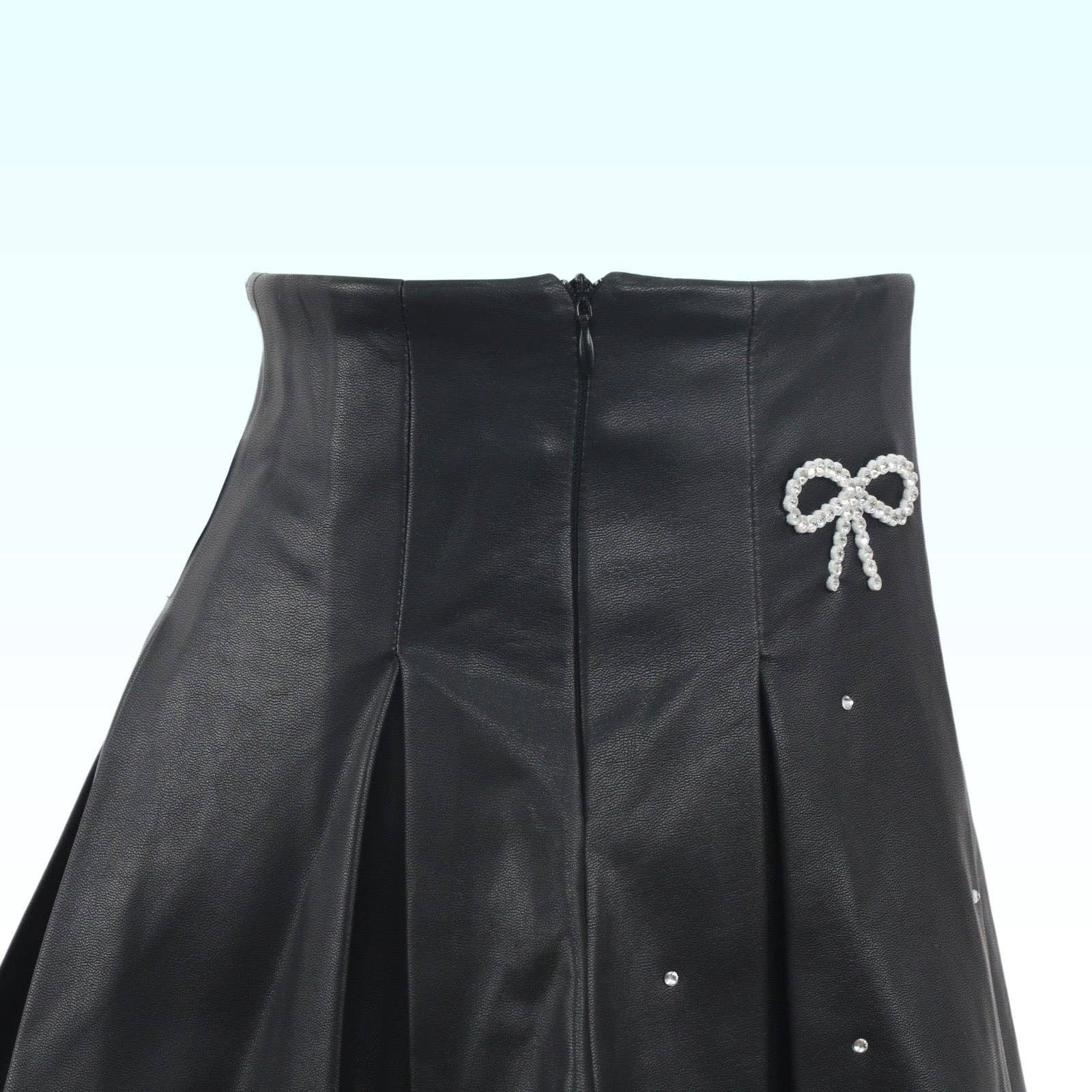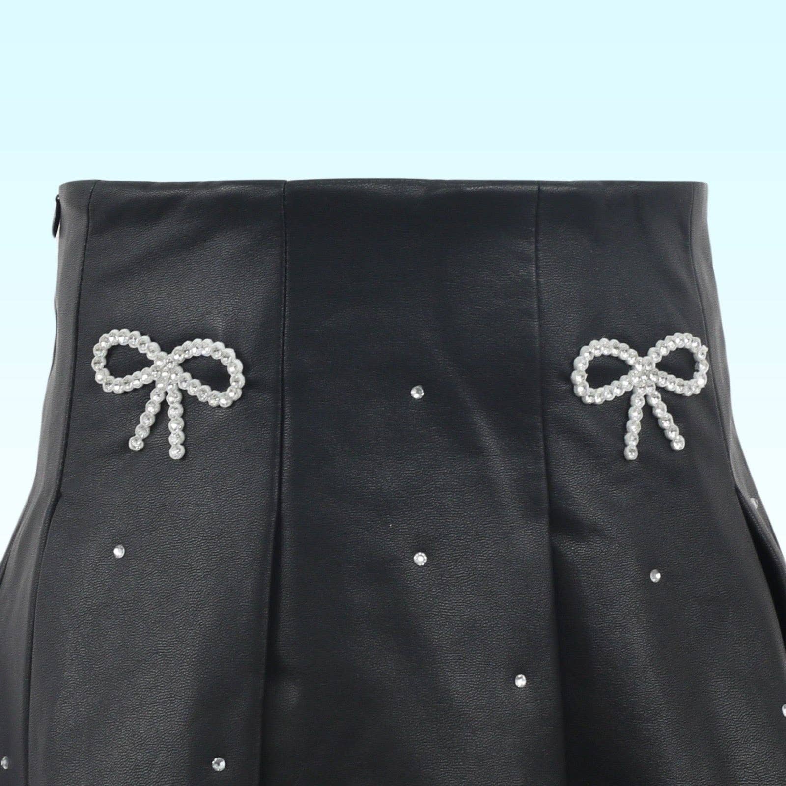 Indulge your little fashionista with our Vegan Leather Bow Gem Skirt. Crafted from sleek black vegan leather, this skirt features a stunning rhinestone bow and sparkles throughout. Your little one will shine and stand out in style.