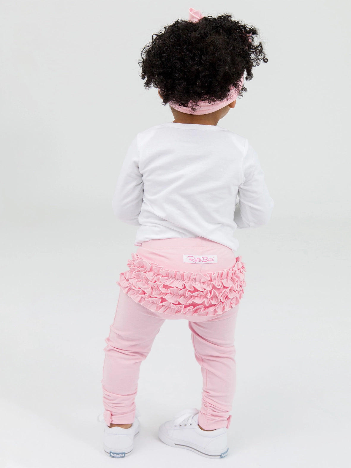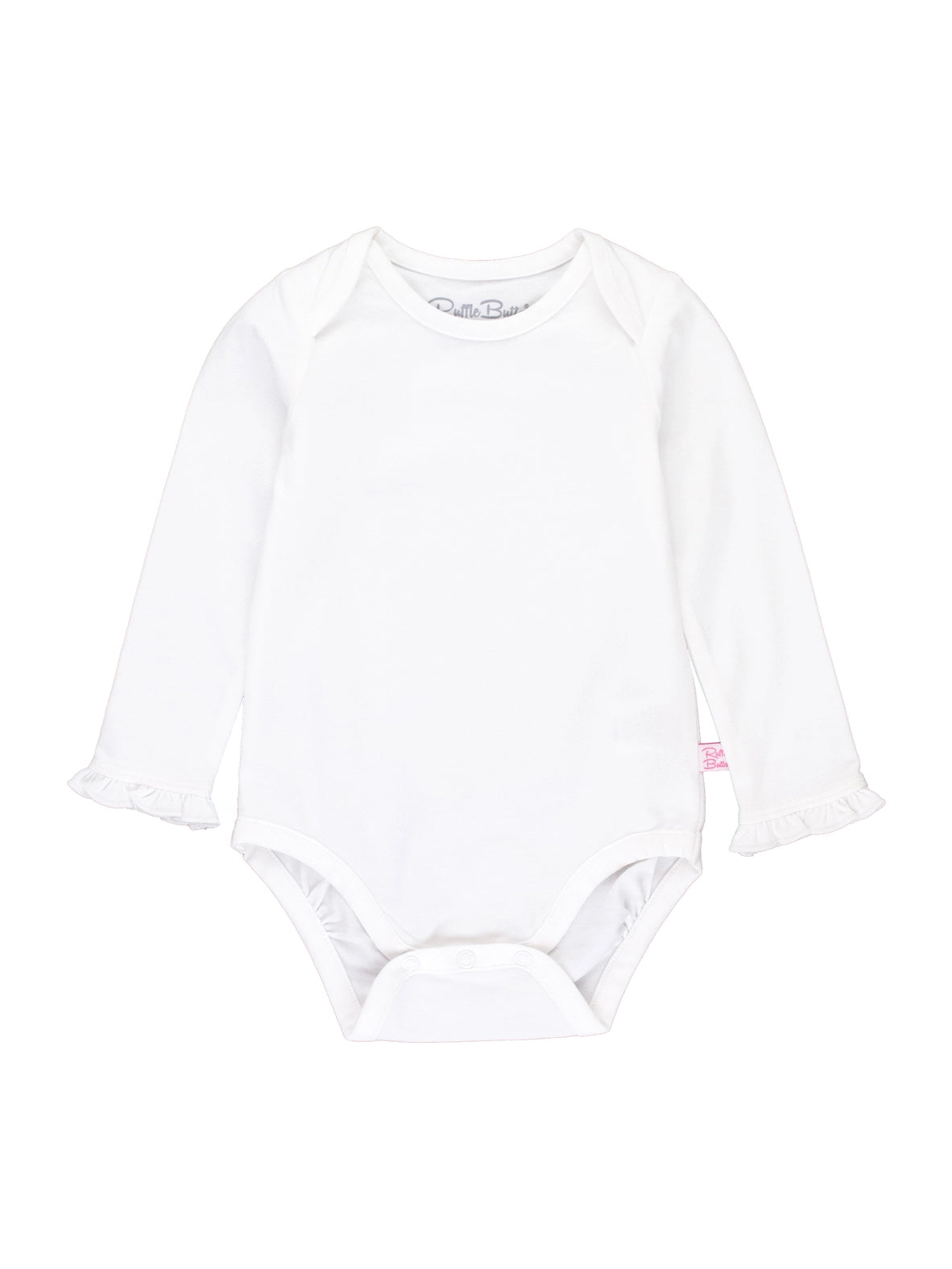 Made from soft, stretchy knit fabric, our White Knit Long Sleeve Ruffle Bodysuit offers a comfy fit with added charm from the ruffle detailing and long sleeves. Featuring a snap closure for easy changing and versatile styling for everyday wear or special occasions. Don't miss our matching shirt for older girls!