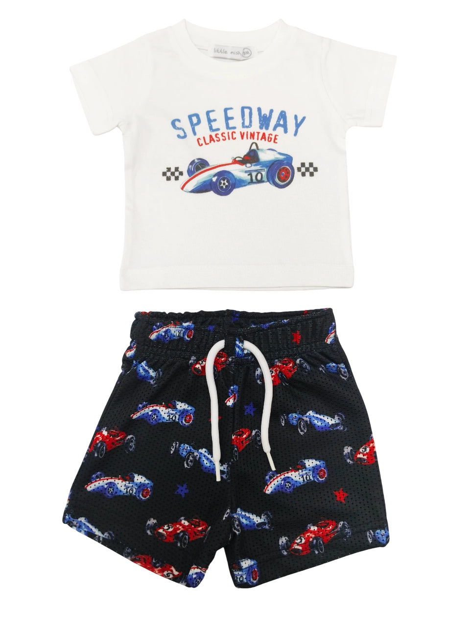 White Tee + Mesh Short Set. Set includes solid short sleeve shirt and printed mesh shorts.
